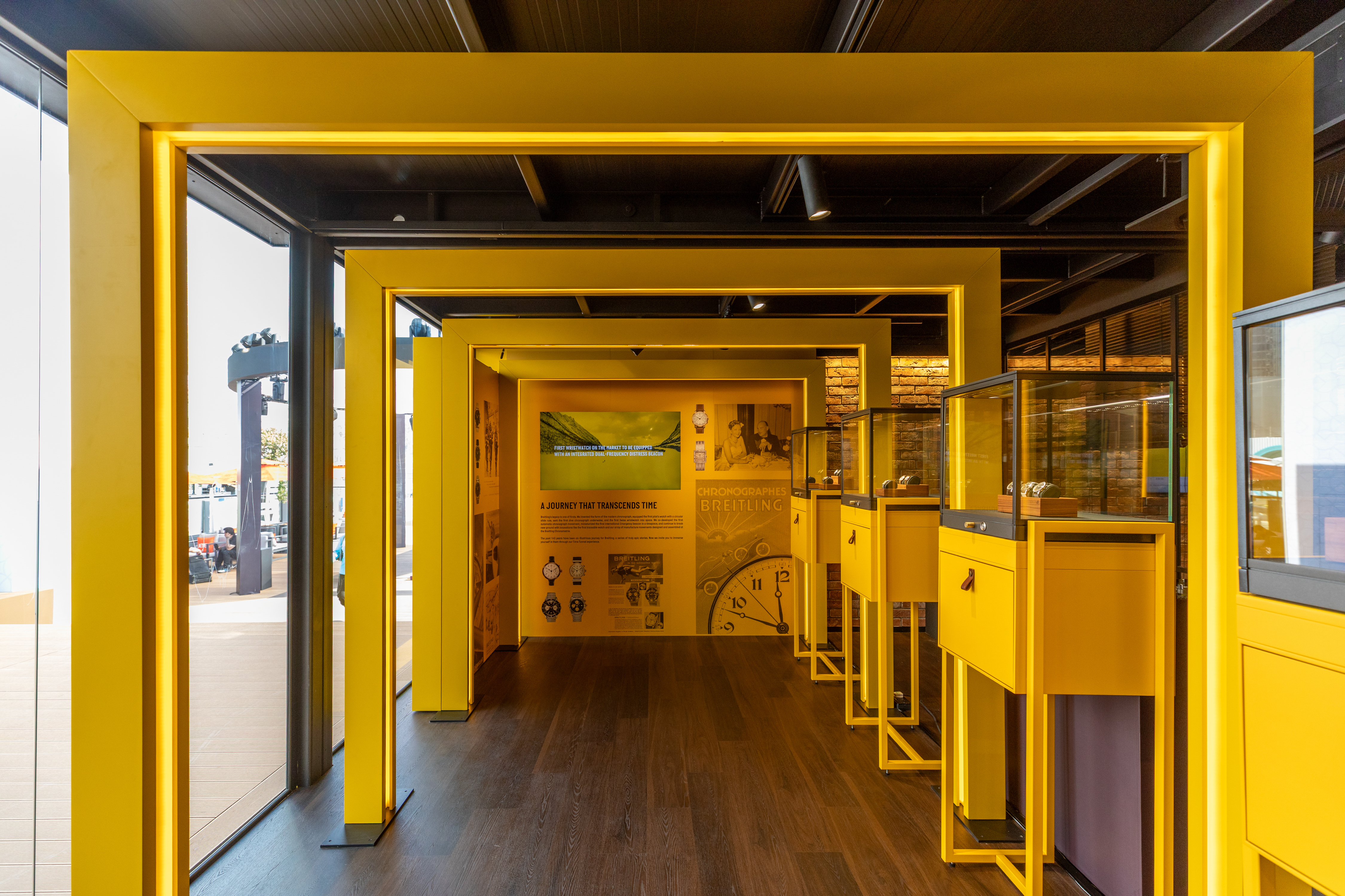 For Breitling, we delivered an immersive installation combining modular innovation with meticulous craftsmanship and luxury finishes. The characteristic setup featured 21 Viewboxes, custom elements, and a feature terrace, all delivered on site.