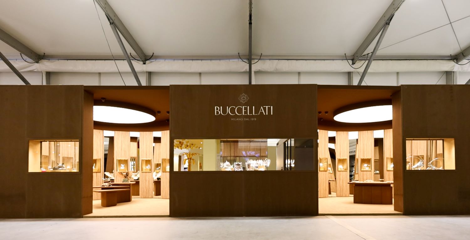 A centrepiece of the project was The Cube, Electra’s award-winning tent structure, constructed across an expansive 170 × 80 meters. Alongside it, a polygonal tent completed the layout, together creating 13,600 sqm of exhibition space. Within this footprint, Electra delivered 23 custom-built stands for leading international and regional brands, including Sobha Furniture, Buccellati, Lal & Ghosn, Stellar Works, Designed in Saudi, Venini, Lasvit, and others.