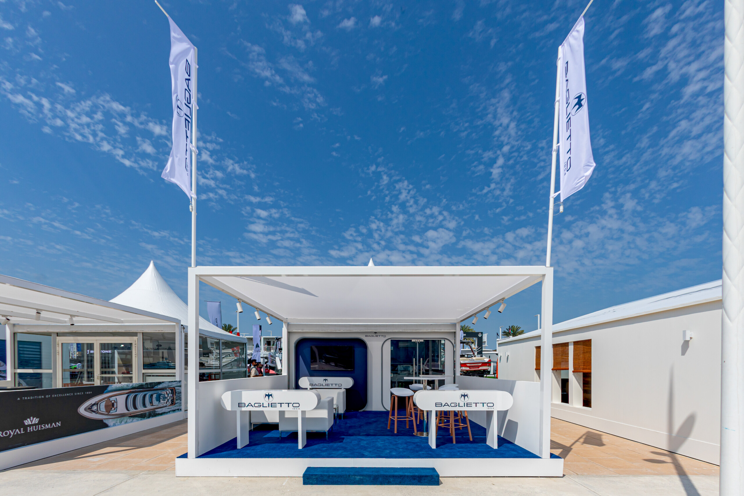 Our in-house production and furniture teams collaborated to craft custom exhibition stands for prestigious brands including Baglietto, Maiora, Yachts 1, Benetti, and World of Yachts – Feadship. Each stand was uniquely designed to reflect the identity and elegance of these renowned yachting companies.