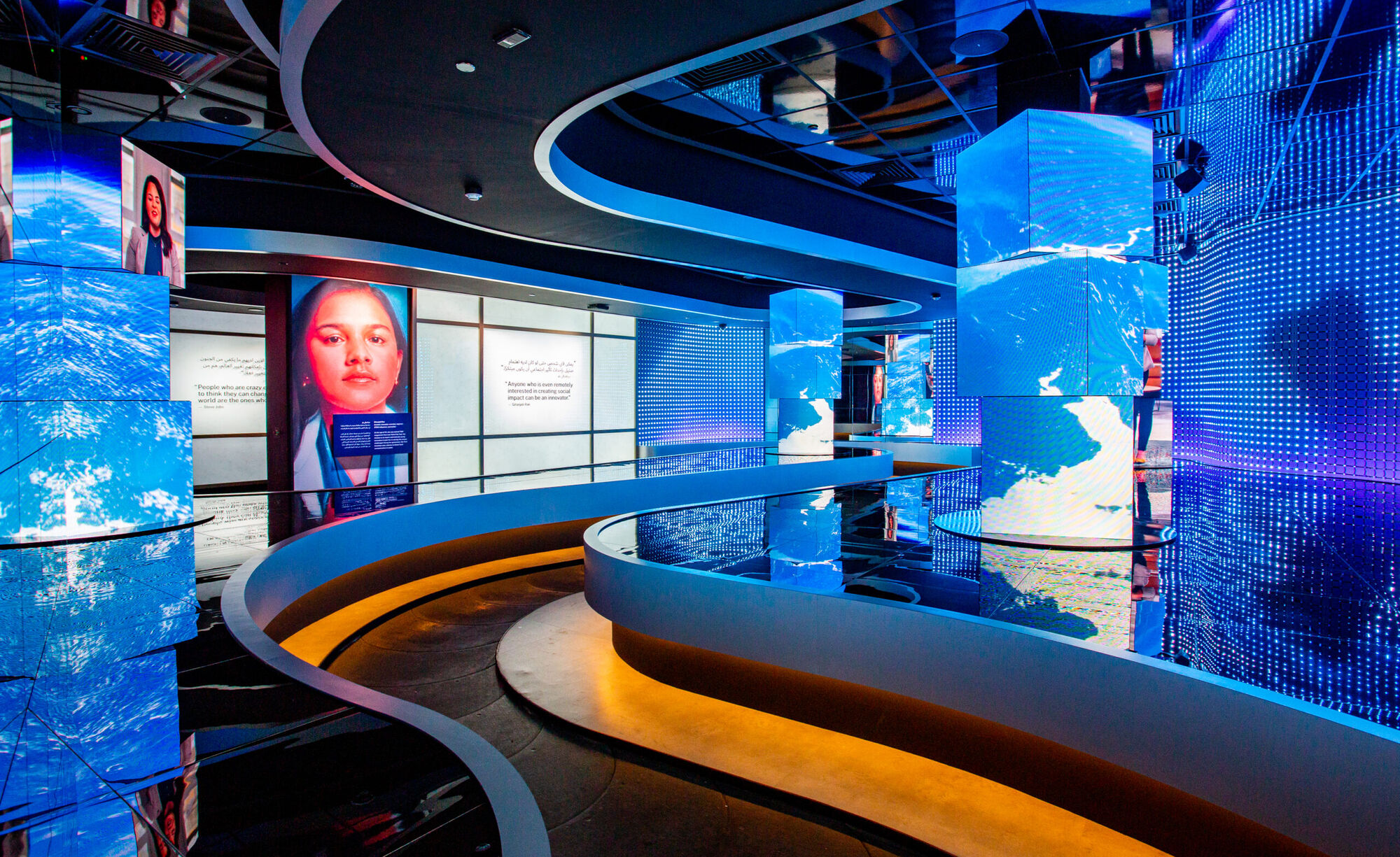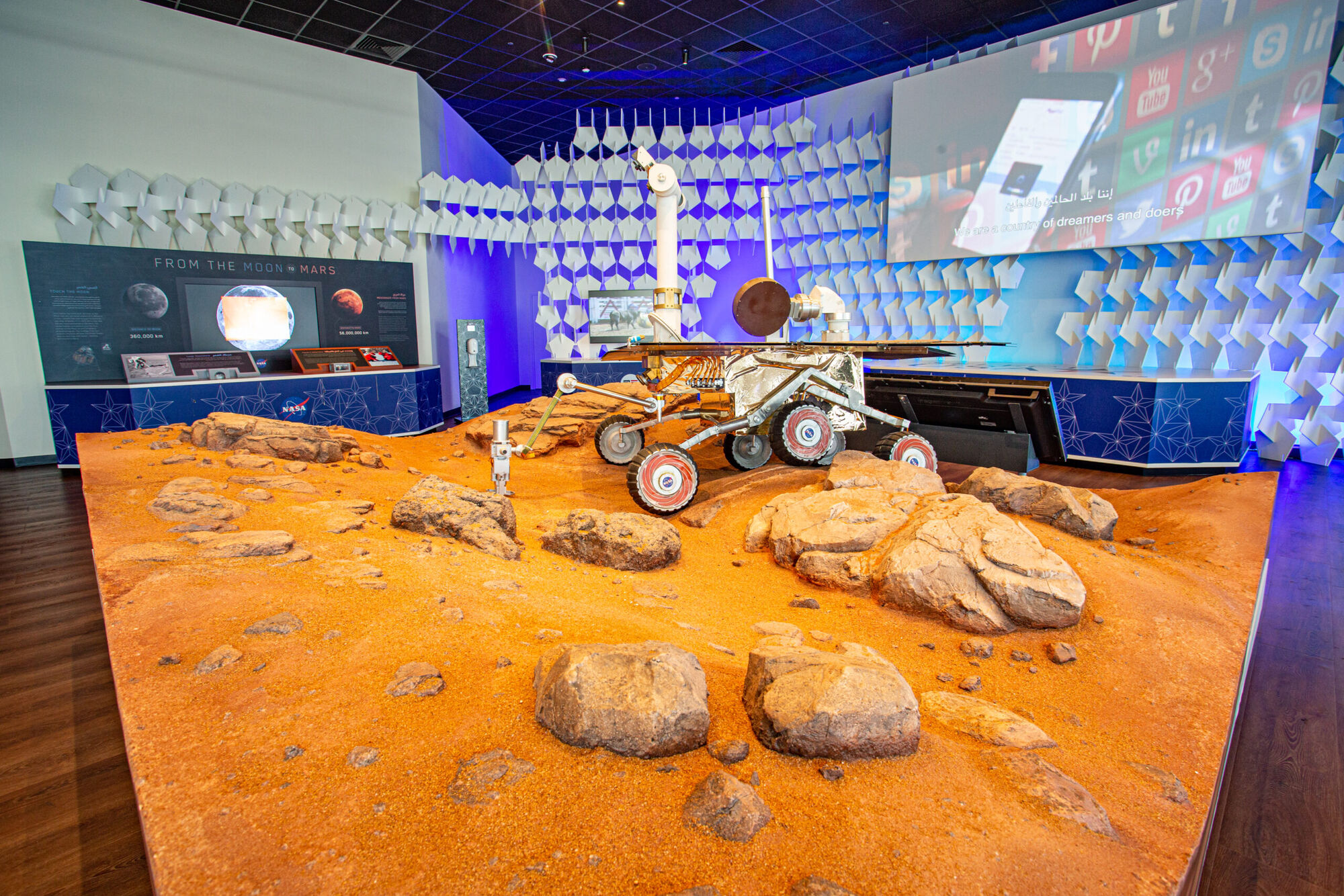 The two-floored exhibition takes visitors on a 20-minute journey through seven different exhibits showcasing the past, present, and future of American innovation. The tour starts with the made to order half-sized ‘Statue of Liberty’ hand and torch followed by the original first iPhone displayed in a screen-covered room. The visitor experience is made effortless with a custom-made moving walkway through the stunning exhibits, notably an 8-minutes augmented reality show representing space and planets on a giant LED screened roof. For this show, Electra produced a 16-foot (5 meters) sphere to represent the Moon, Mars, and much more.