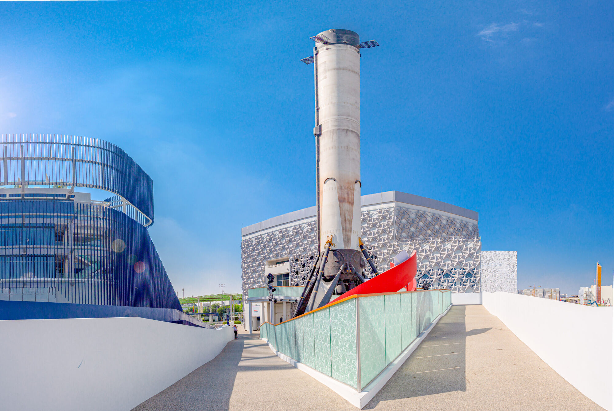 In addition, the USA Pavilion includes one restaurant, one bar, one VIP area, backstage parkour for the staff, and 3 elevators (1 with panoramic view). Electra also made possible the full-scale replica of the Falcon 9 rocket that is culminating at 137 feet (42 meters), making it the second tallest structure in Expo. This exhibit also marks the first-ever production to use Black 3.0, the blackest and mattest acrylic paint on the planet.